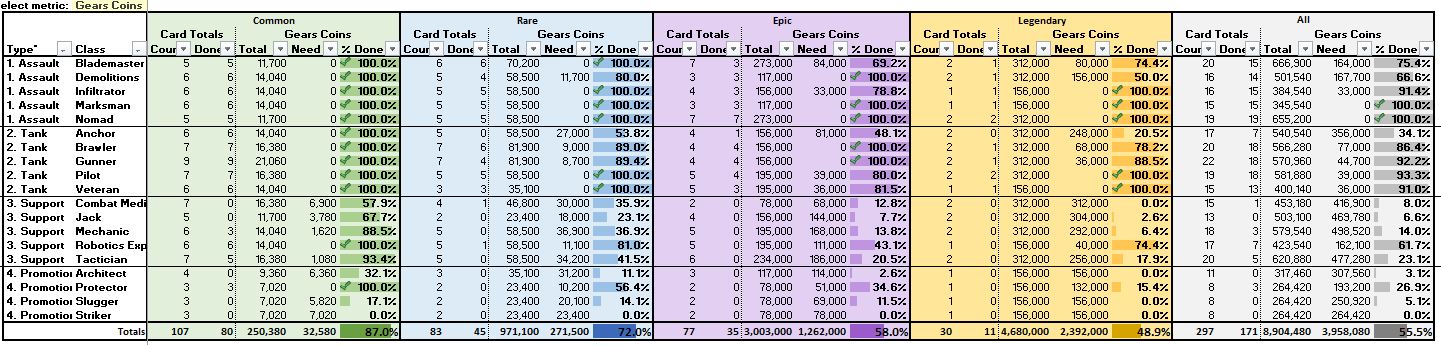 I put together a spreadsheet a while back to keep up with my card/skills data so that I would know how far away I was from maxing certain classes, either via the number of Card Dupes I needed or the Gears Coins required to reach max.