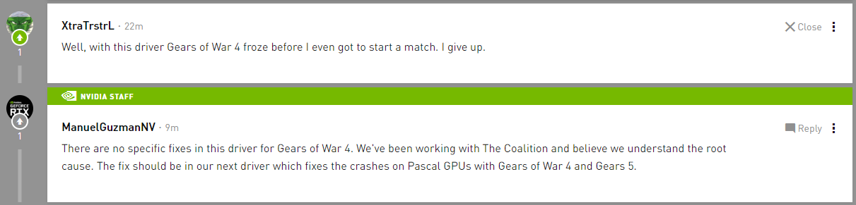 Yeah it’s a shame man I’m tired of the dance… Delete, reinstall, try this driver and that driver. I’ve sent dumps I’ve done work arounds and then they bring the same nonsense to gears 5. At least keep us in the loop these MF say it’s a known issue and we are working closely with Nvidia for over 2yrs, Nvidia says the same. Tell us something!!