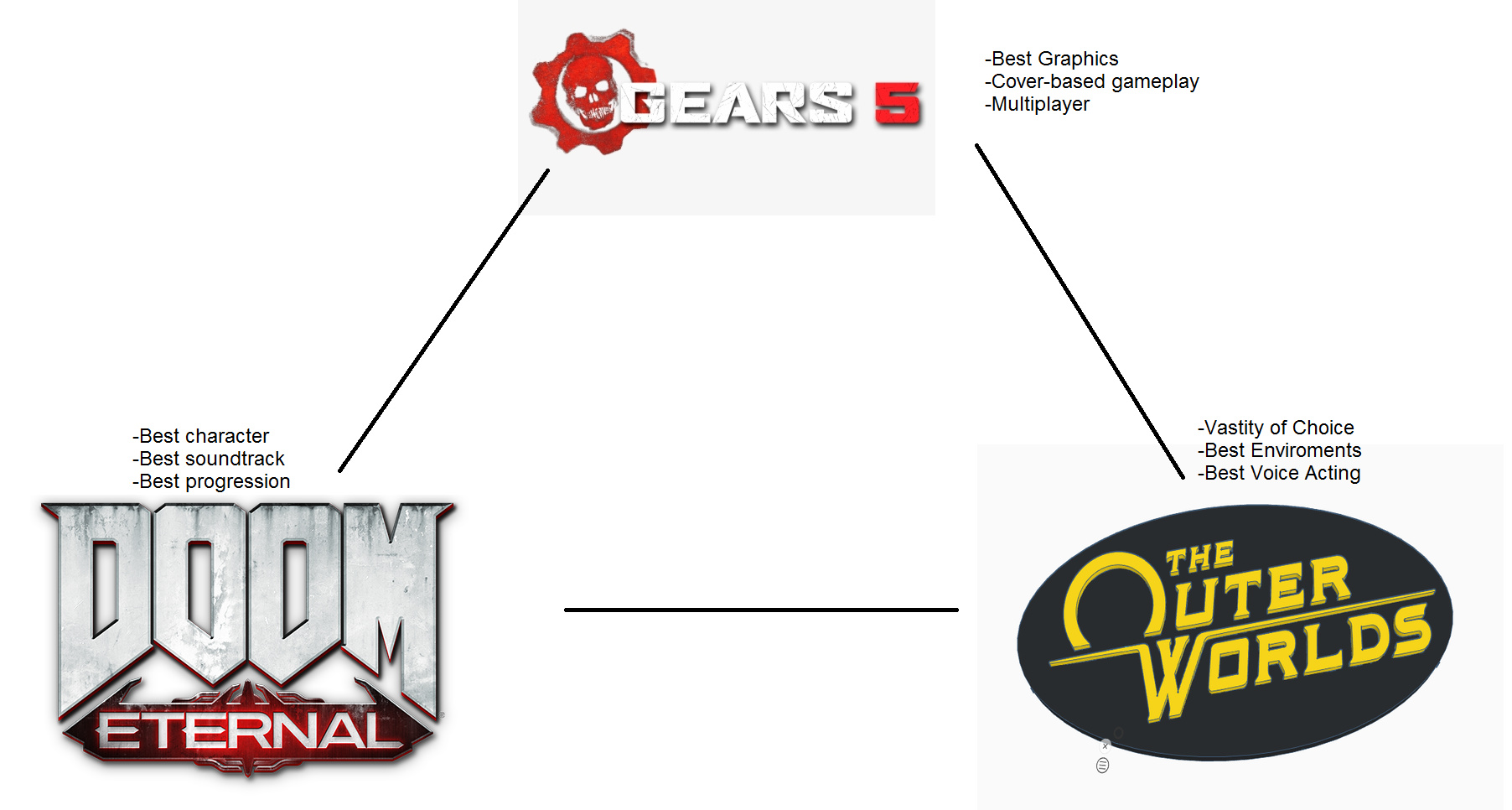 -The Outer World has the best enviroment , characters (actual persons , companions) and freedom of choice , but it lacks a strong soundtrack and also the astonishing graphics and fluidity of both Doom and Gears.