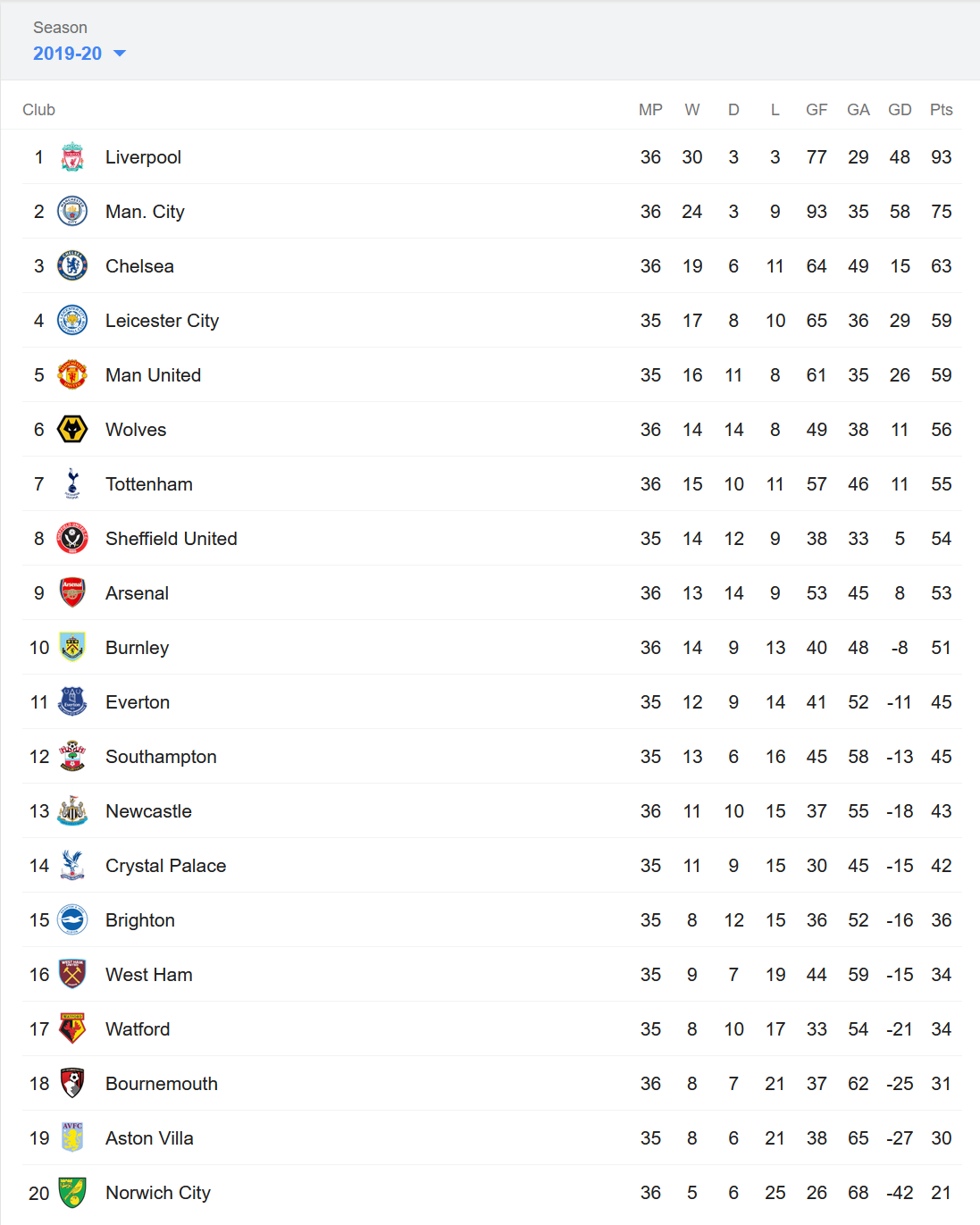 Here’s the English Premier League Table (I don’t follow football so I have no preference, this is an example using your own point)