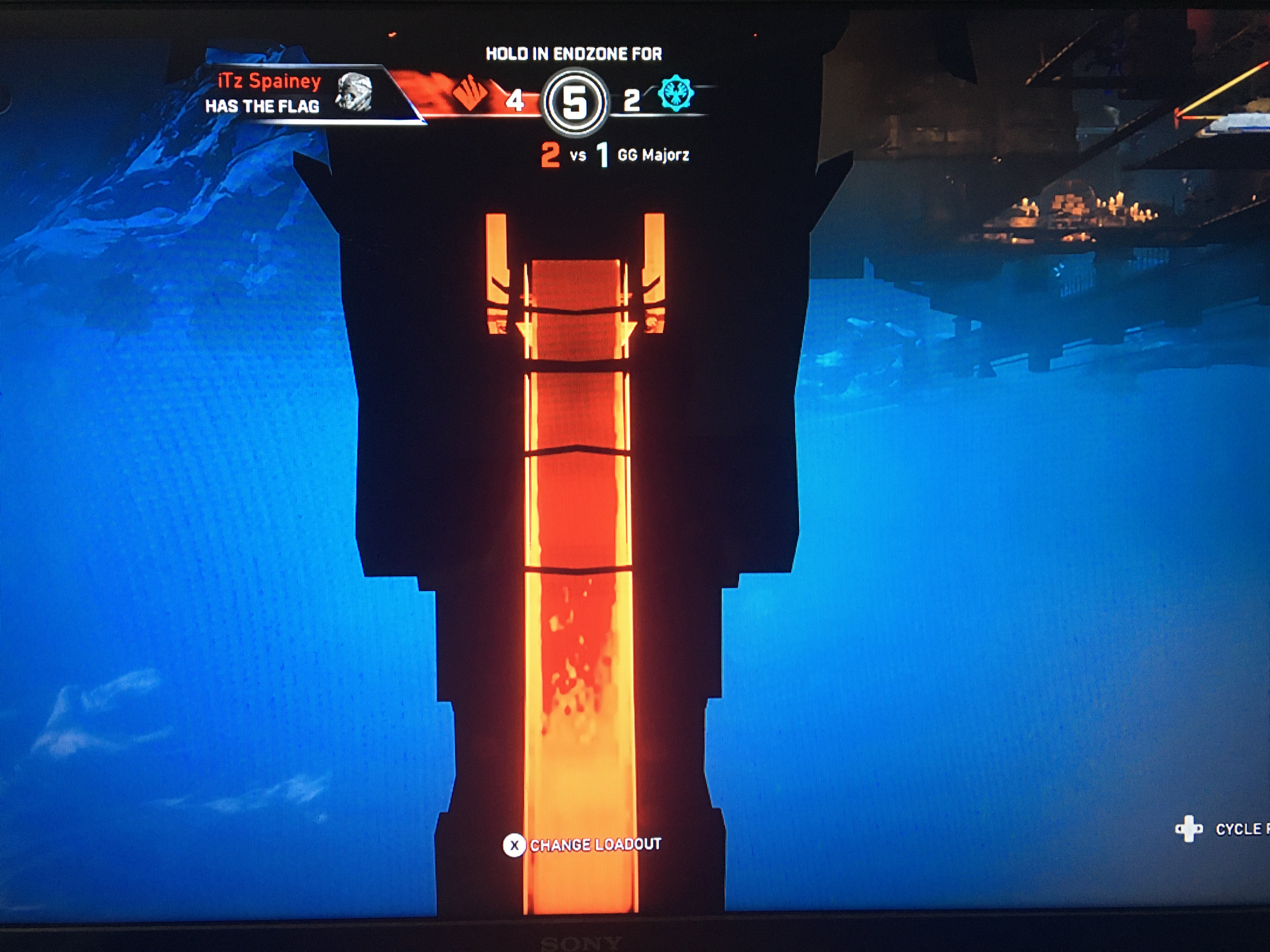 Playing Gridiron on Asylum, tried to score a touchdown with the flag but started to get shot. Tried to take cover on the on the bit with the tree inside it on the edge of the Endzone and got downed as I took cover.