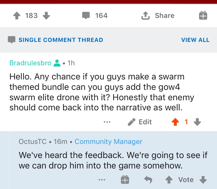 I’ve been trying to talk to TC about adding in the elite drone from 4 but they’ve been tiptoeing around the subject. I asked Octus on Reddit and he said they were trying to add him back into the game somehow. The thing is I’m not sure if he ever passed this feedback to the rest of the team before he left. Also I found a picture of the elite drone within gears 5 for the horde reveal but he could just be from the dev kit as something leftover. We need to let TC know we want this guy back in the lore and for multiplayer but I need your guys help giving this feedback. Maybe @GhostofDelta2 can help tag all of the TC devs on this forum if he’s still a moderator?
