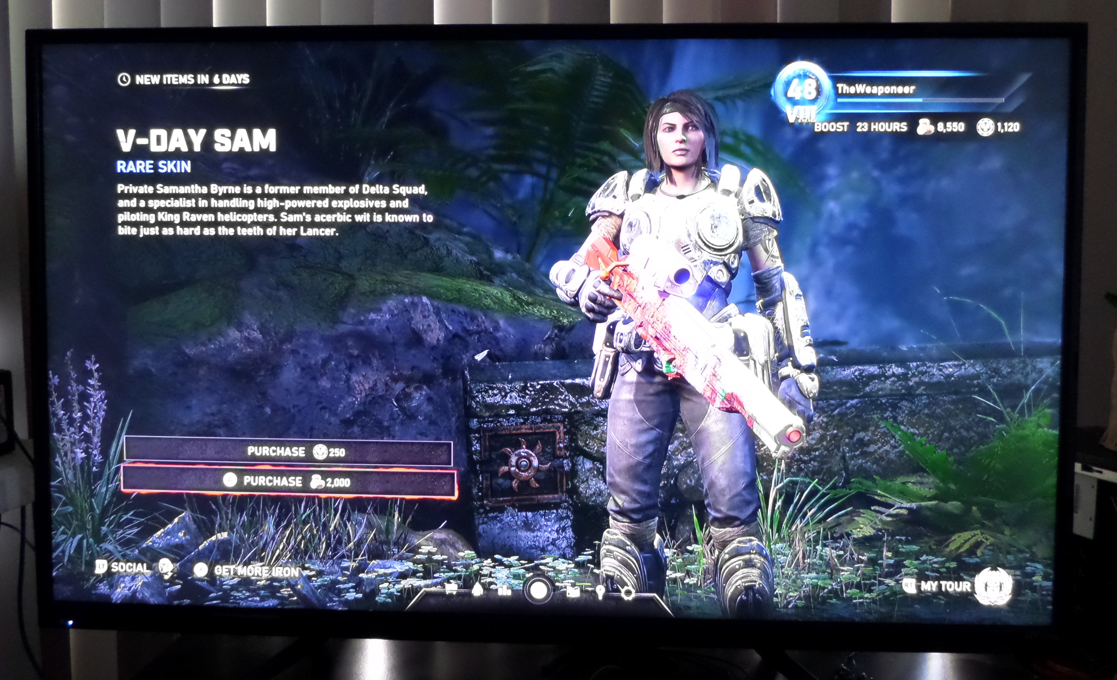 The Gears 5 “Elizabeth Hurley” skin, aka the V-Day Sam skin showed up in the store today.