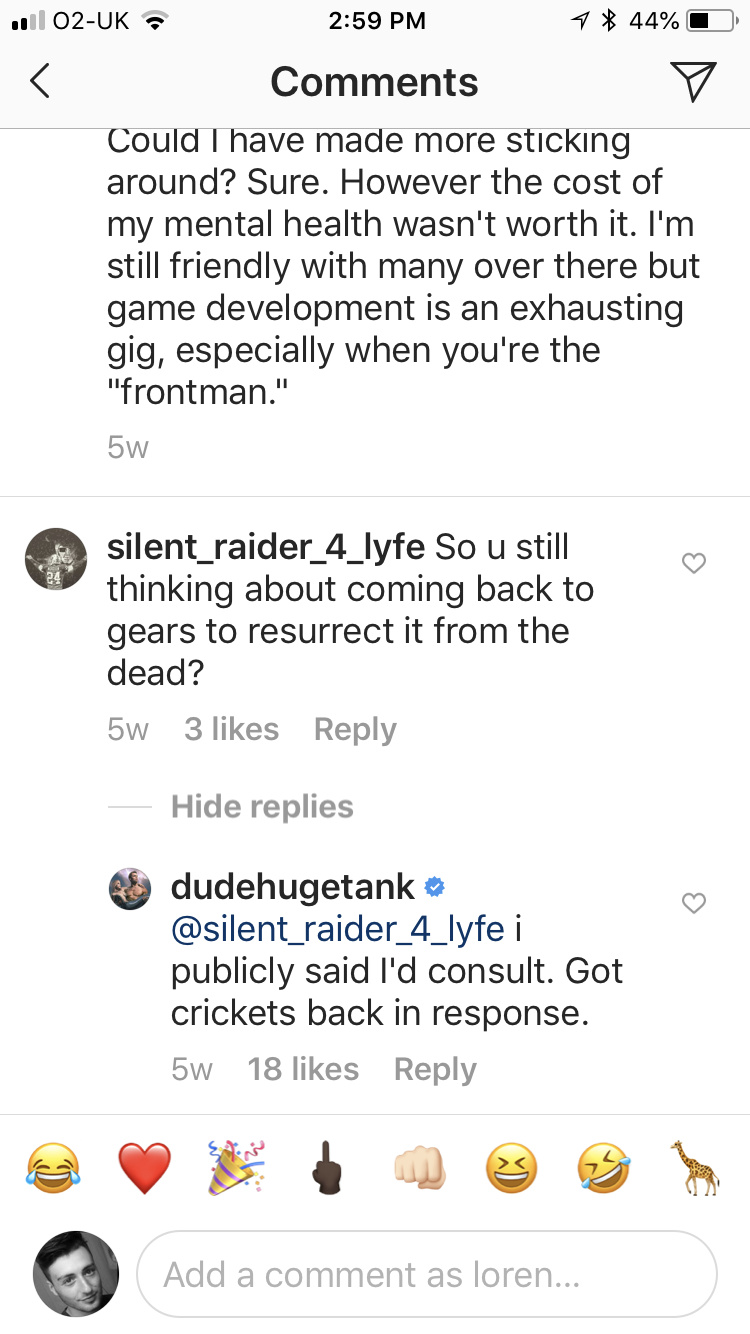 This picture was 5 weeks ago 2020 on his Instagram him saying he’s put his offer to Microsoft and coalition to help with gears 6 and as you can read he put “heard crickets In response” he’s hasn’t heard anything back but he wants to come back to gears, we have a voice and we can help make this happen but negative people like you gears will defiantly be dead as we want people developing this game who knows gears not bob down the road. You’ve been on a forum for years? That doesn’t mean nothing Lol, iv been playing gears since 06 not on a little forum since 06 I know this game more than any other game fella and I play competive online from 1 to 5 I don’t judge an old developer that made a great trilogy.