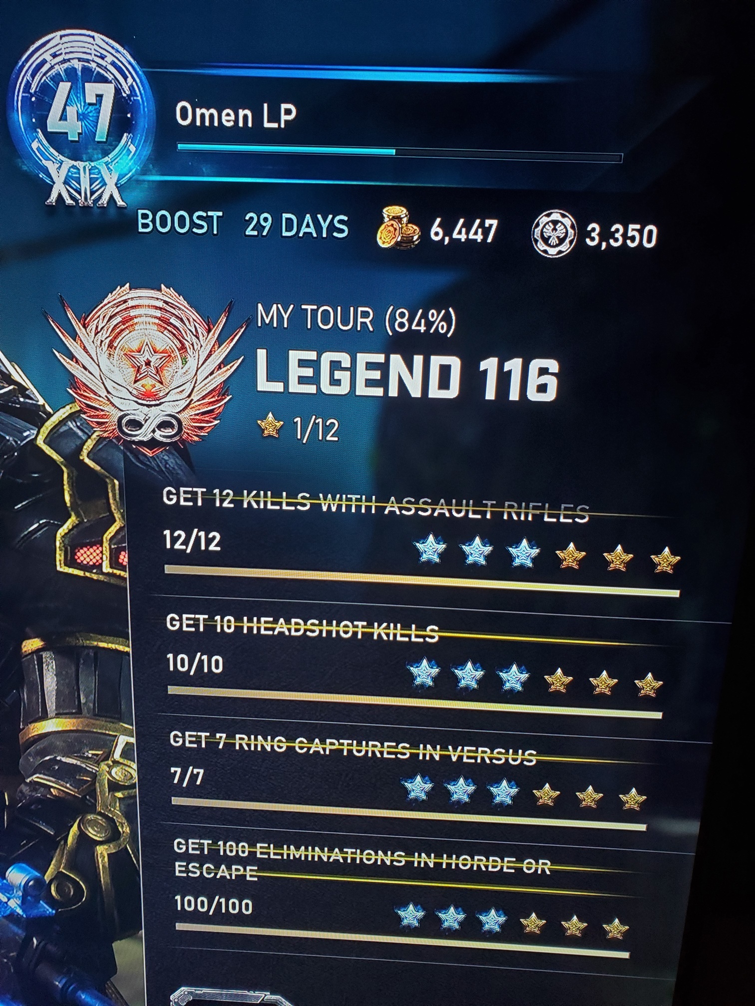 Iām currently at Legend 61 for Tour of Duty. No Iron re-rolls spent. Havenāt really actively chased the Versus or Ranked Medals. But playing a lot of Escape time may have contributed to it. Around 70-80% Medals progress.